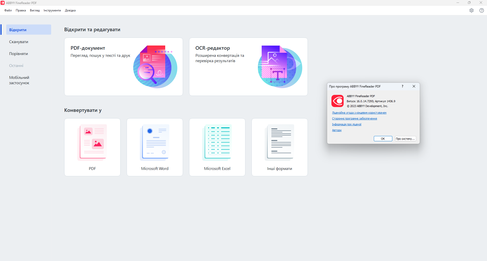 ABBYY FineReader 15 – це універсальний інструмент для роботи з паперовими та PDF-документами на цифровому робочому місці. У програмі використовуються технології оптичного розпізнавання символів та конвертації документів, що ґрунтуються на можливостях штучного інтелекту. Це дозволяє швидше отримувати корисну інформацію з документів та підвищувати продуктивність праці. Ви зможете легко створювати, оцифровувати, конвертувати та редагувати паперові та PDF-документи, вести по них пошук, захищати їх вміст і працювати над ними спільно з іншими користувачами.
