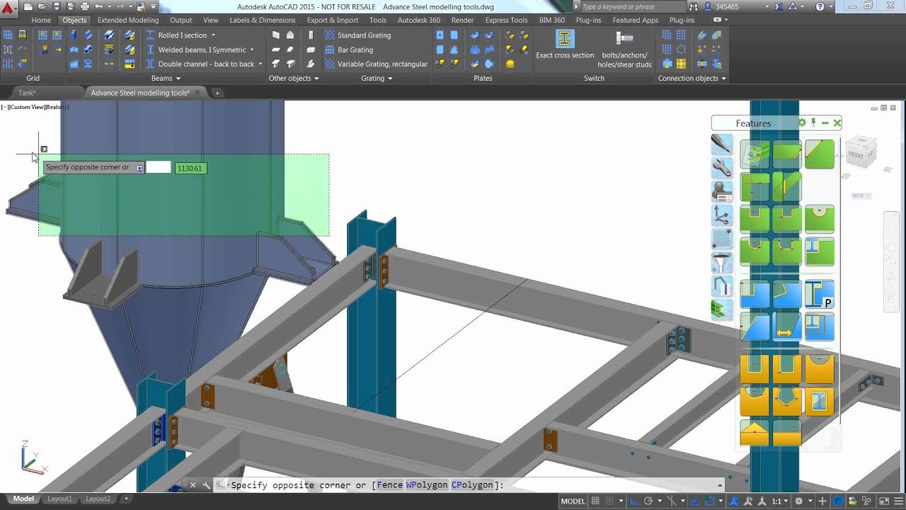 На першому етапі Advance Steel надає користувачеві велику бібліотеку елементів будівельних конструкцій та функцій моделювання, таких як:
