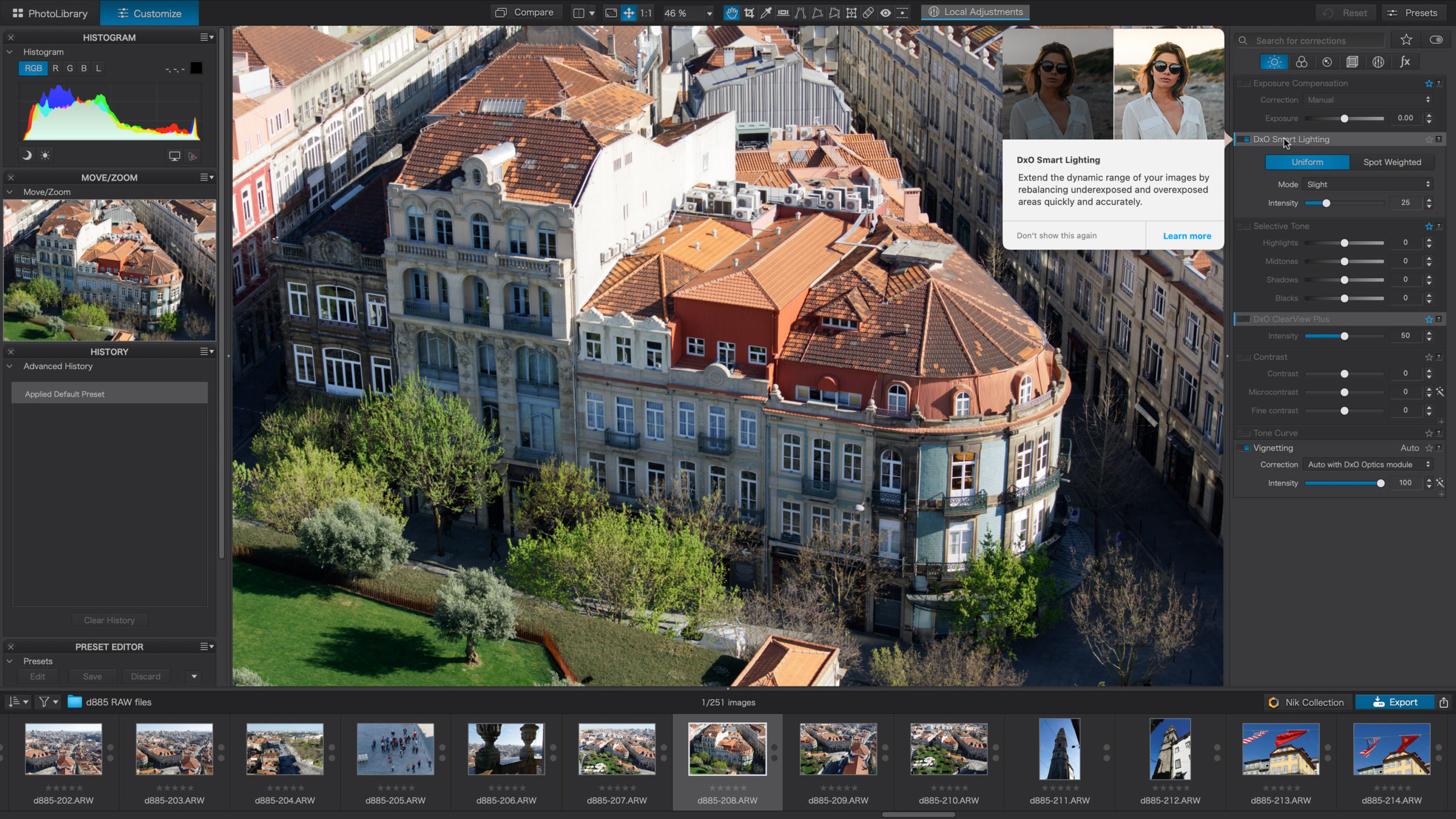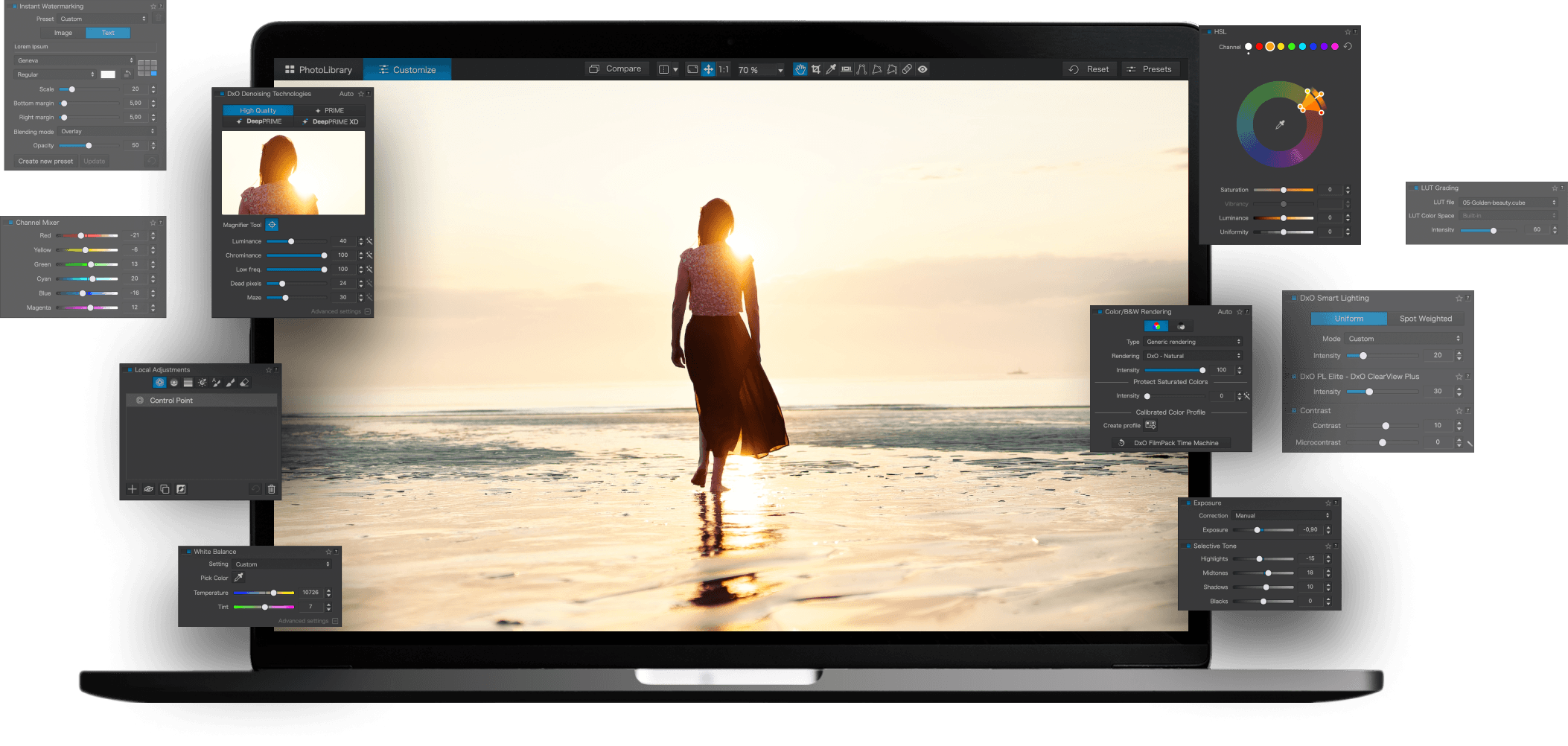DxO PhotoLab (раніше DxO Optics Pro) надає повний набір допоміжних інтелектуальних виправлень, які ви можете налаштувати вручну в будь-який час. Керуйте кожним аспектом ваших фотографій: ефективно видаляйте шум, позбавляйтеся обмежень освітлення, відновлюйте деталі кольору, застосовуйте складні оптичні корекції та покращуйте деталі.