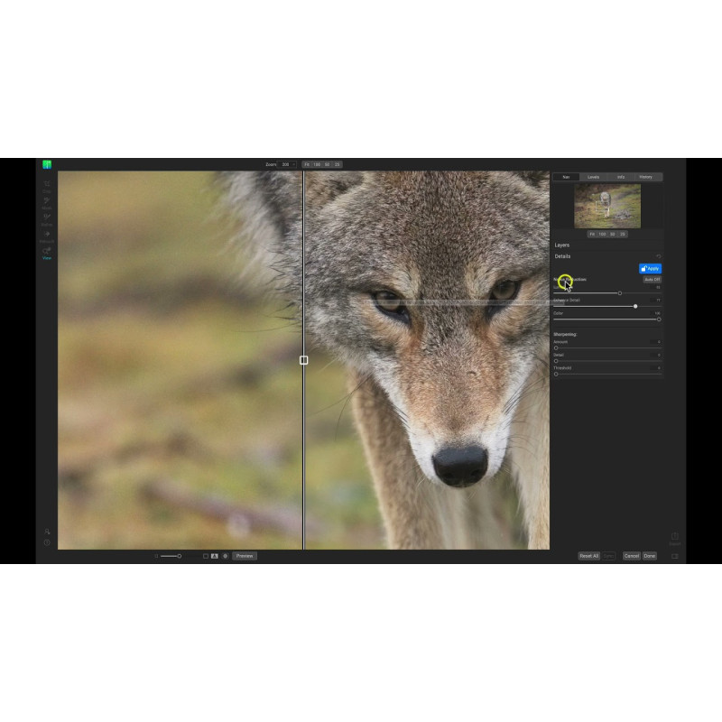 ON1 NoNoise AI дозволяє автоматично виділяти деталі та видаляти шум з фотографії, щоб покращити якість зображення.Використовувати AI-освітлення для покращення якості зображення
